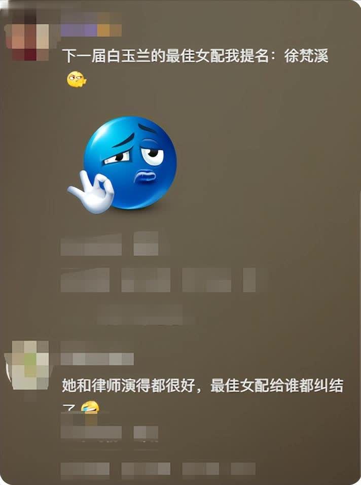 观众也十分认可徐梵溪的演技,在《以法之名》的官方账号关于徐梵溪的评论区发了希望明年的白玉兰配角提名可以看到她的名字。