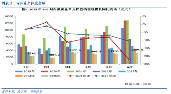 从高频数据来看,30大中城市数据,6月商品房成交面积同比为-8.56%,5月为-3.2%。从房企层面来看,根据克尔瑞的统计,“2025年6月,TOP100房企实现单月销售操盘金额3389.6亿元,环比增长14.7%。上半年累计实现销售操盘金额16526.8亿元。”