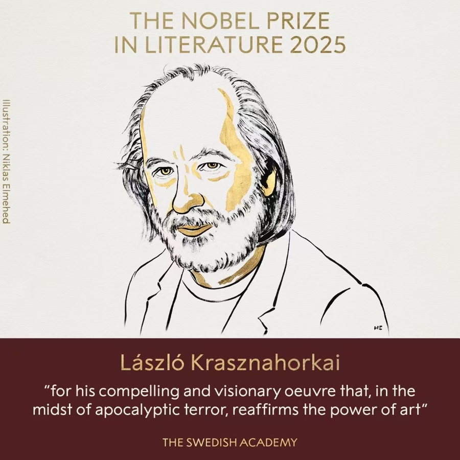 北京时间10月9日19时,2025年诺贝尔文学奖在瑞典揭晓,颁给匈牙利作家拉斯洛·克拉斯纳霍尔凯 (László Krasznahorkai),以表彰“他那震撼人心、富有远见的创作,在灾难与恐惧的时代,重申了艺术的力量。”